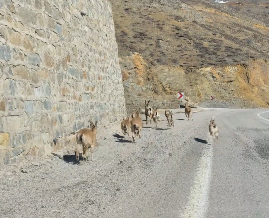 Gümüşhane’nin Bahçeli beldesinde yavrularıyla birlikte gezinen yaban keçisi sürüsü, cep telefonu kamerasıyla görüntülendi. Bahçeli beldesinde kaydedilen görüntülerde sürü halinde yol üzerinde ilerleyen yaban keçileri, kendilerine yaklaşan aracı fark edince hızla kaçmaya başladı. Kısa sürede yoldan çıkarak dağa doğru yönelen keçiler, yavrularıyla birlikte sarp kayalıklara tırmanarak gözden kayboldu.