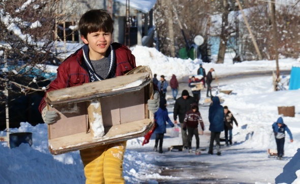 Doğu Anadolu Bölgesinde etkili olan kar yağışı, en çok kızaklarla kayan çocukları sevindirdi. Van’ın Gevaş ilçesinde, pandemi kısıtlaması nedeniyle günün belli saatlerinde dışarı çıkan çocuklar, kendi imkanlarıyla yaptıkları kızaklarla kayarak karın keyfini çıkardı.