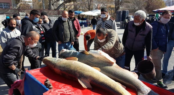 Erzincan’ın Kemaliye ilçesinden geçen Fırat Nehri'nde 30 yıllık balıkçı tarafından oltayla yakalanan dev turna balıkları görenleri hayrete düşürdü. 95 ve 65 kilo ağırlığındaki iki turna balığı pazarda satışa sunulurken, balıkları görmek isteyenler şaşkınlıktan sosyal mesafeyi unuttu.