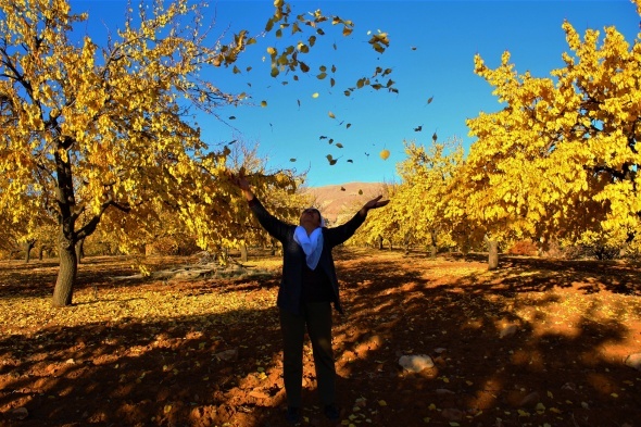 Bahçe sahibi Remziye Çetin, “Sonbahar mevsimi olunca doğaseverler daha fazla merak salıyor. Yazın altın sarısı görünümünde olan kayısı şuanda altın yaprak görünümünde" dedi.