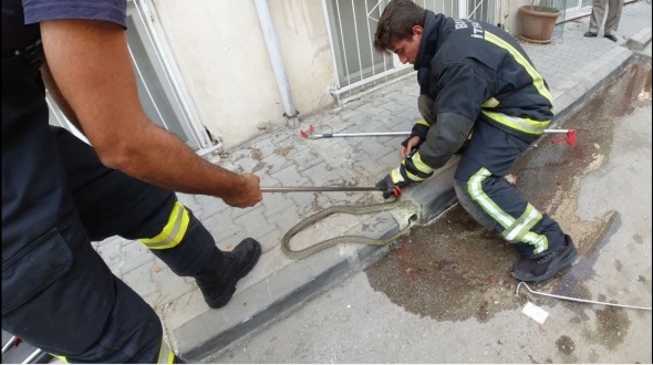 İtfaiye erleri 15 dakikalık zorlu bir çalışma sonrasında yılanı bulunduğu oluktan çıkartarak mahallelinin rahat bir nefes almasını sağladı.