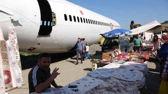 Trabzon Havalimanı’ndan 15 km uzaklıktaki Yomra ilçesine karayoluyla yaklaşık 4 saatte taşınan uçağı sabah geldiklerinde pazar yerinde gören pazarcılar ne yapacağını şaşırırken, uçak pazarcı esnafının espri kaynağı oldu.