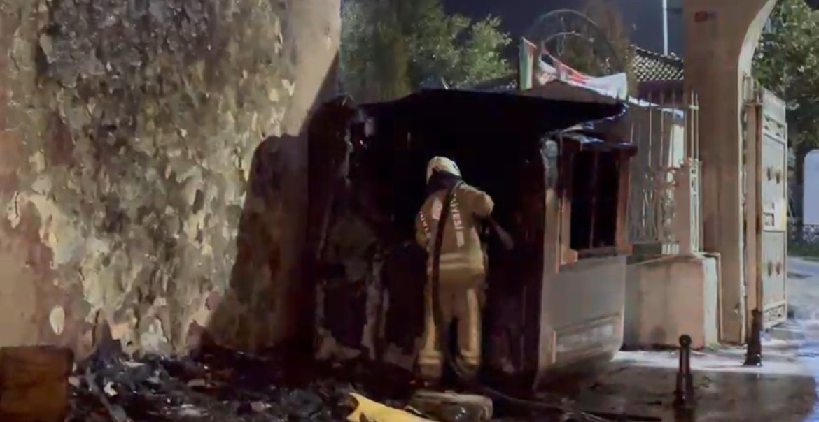 İstanbul Fatih’te cami dışındaki güvenlik kulübesi alev alev yandı. Olay, Fatih Sümbül Efendi Mahallesi’nde bulunan Sümbül Efendi Cami’nin kapı kısmında meydana geldi. İddiaya göre, caminin önündeki güvenlik kulübesinde henüz bilinmeyen bir nedenle yangın çıktı. Giderek büyüyen yangın tüm kulübeyi sardı. İhbar üzerine olay yerine itfaiye, polis ve sağlık ekipleri sevk edildi. Yangın, itfaiye ekiplerince kontrol altına alınarak söndürülürken yanan kulübe kullanılamaz hale geldi. Kulübenin yanındaki hamamın duvarı da yangın sebebiyle zarar gördü. Kulübenin alev alev yandığı anlar çevredeki vatandaşların cep telefonu kamerasıyla kaydedildi.