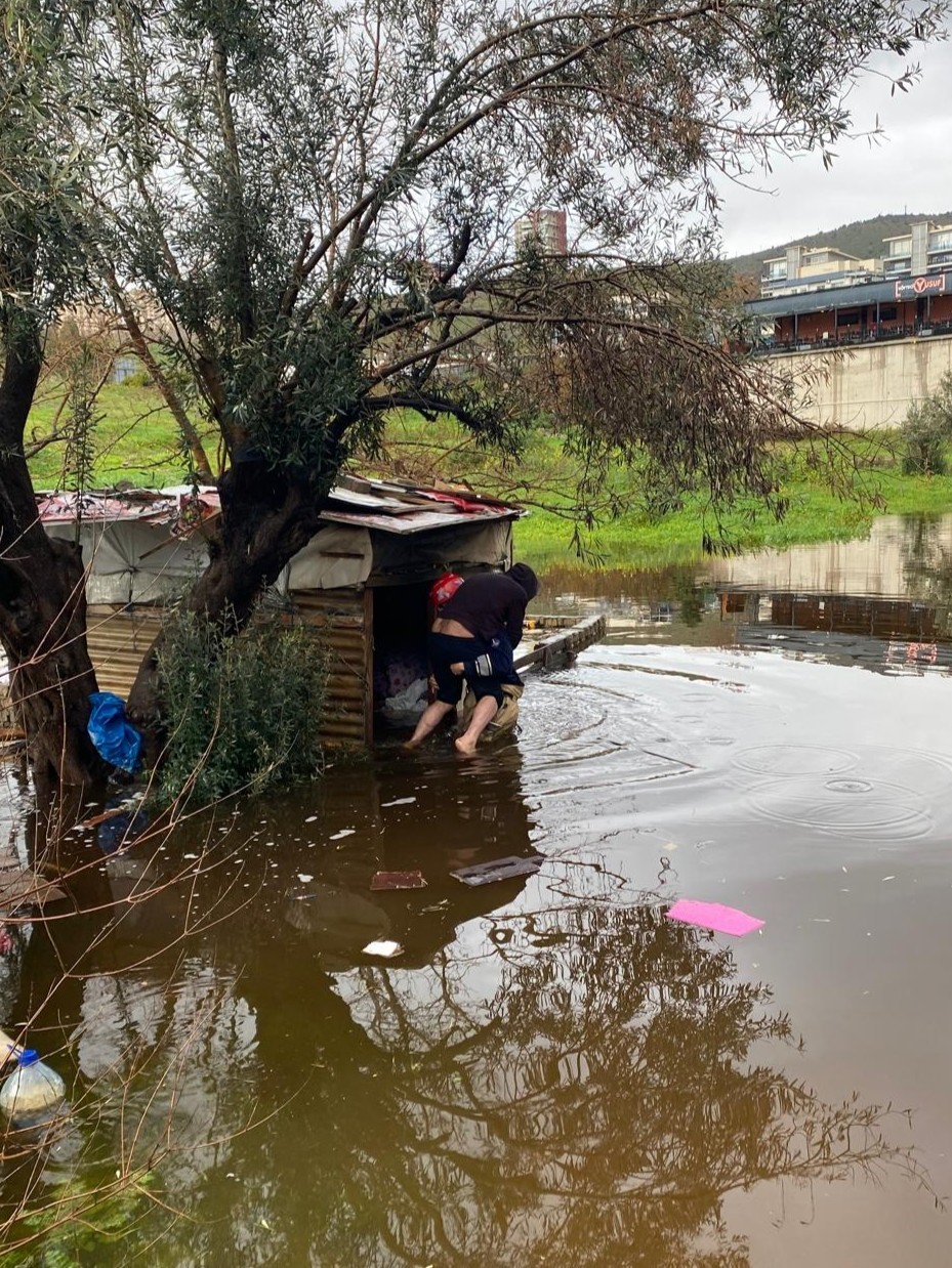 İzmir’de etkili olan şiddetli yağış sırasında boş arazideki barakaya sığınan bir kişi suların yükselmesiyle birlikte bulunduğu yerde mahsur kalınca itfaiye ekiplerine haber verildi. Olay yerine gelen İzmir İtfaiyesi’nde görevli Alper Aksular zor durumdaki vatandaşı çevresi suyla kaplı barakadan sırtında taşıyarak çıkardı. İzmir Büyükşehir Belediyesi İtfaiye Dairesi Başkanlığı ekipleri, kentte etkisini sürdüren sağanak yağışlar nedeniyle yoğun mesai harcıyor. Bir yandan yağışların olumsuz etkilerini azaltmak için çalışan ekipler, diğer yandan özverili çalışmalarıyla yurttaşların yaşamlarına dokunuyor. Karşıyaka Örnekköy Mahallesi 7532 Sokak’ta şiddetli yağışın ardından su seviyesinin yükselmesi nedeniyle 56 yaşındaki D.D. yaşadığı barakada mahsur kaldı. İhbar üzerine olay yerine Karşıyaka Grubu’nda görevli itfaiye eri Alper Aksular, Ali Akyar ve Cemal Zeytünlü yönlendirildi. Zorlu mücadele sevindiren sonuç İtfaiye eri Alper Aksular araziyi kaplayan suyun ortasında yalnız kalan D.D’yi sırtına aldı. Bel hizasındaki suyu aşarak güvenli alana doğru ilerleyen Aksular, ekip arkadaşlarının yardımıyla mağduru sudan çıkardı. Ekipler tarafından güvenli alana çıkarılan D.D’nin ilk kontrollerinde sağlık durumunun iyi olduğu ve herhangi bir tıbbi müdahaleye ihtiyaç duymadığı tespit edildi.