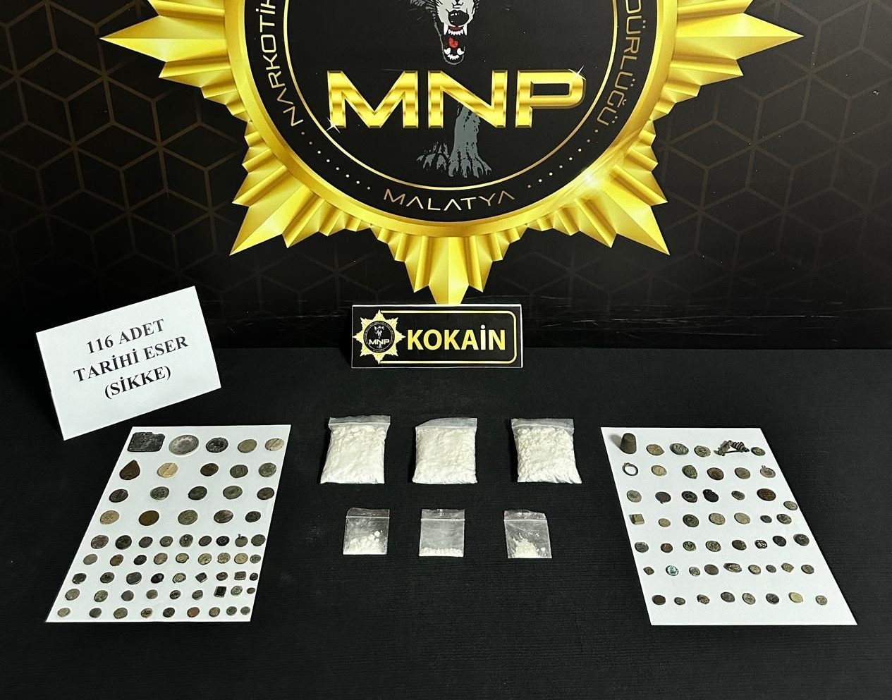 Malatya’da, torbacı olarak tabir edilen sokak satıcılarına yönelik düzenlenen operasyonda uyuşturucu madde ve tarihi eser niteliğinde sikkeler ele geçirildi. Operasyonda gözaltına alınan 1 şüpheli tutuklandı. Malatya’da, İl Emniyet Müdürlüğü Narkotik Suçlarla Mücadele Şube Müdürlüğü ekipleri tarafından sokak satıcılarına yönelik fiziki takipli operasyon gerçekleştirildi. Bir iş yerinde ve bir şüphelinin üzerinde yapılan aramalarda 167 gram kokain ile 116 adet tarihi eser niteliğinde sikke ele geçirildi. Operasyonda gözaltına alınan Y.E.Y., çıkarıldığı mahkemece tutuklanarak cezaevine gönderildi.