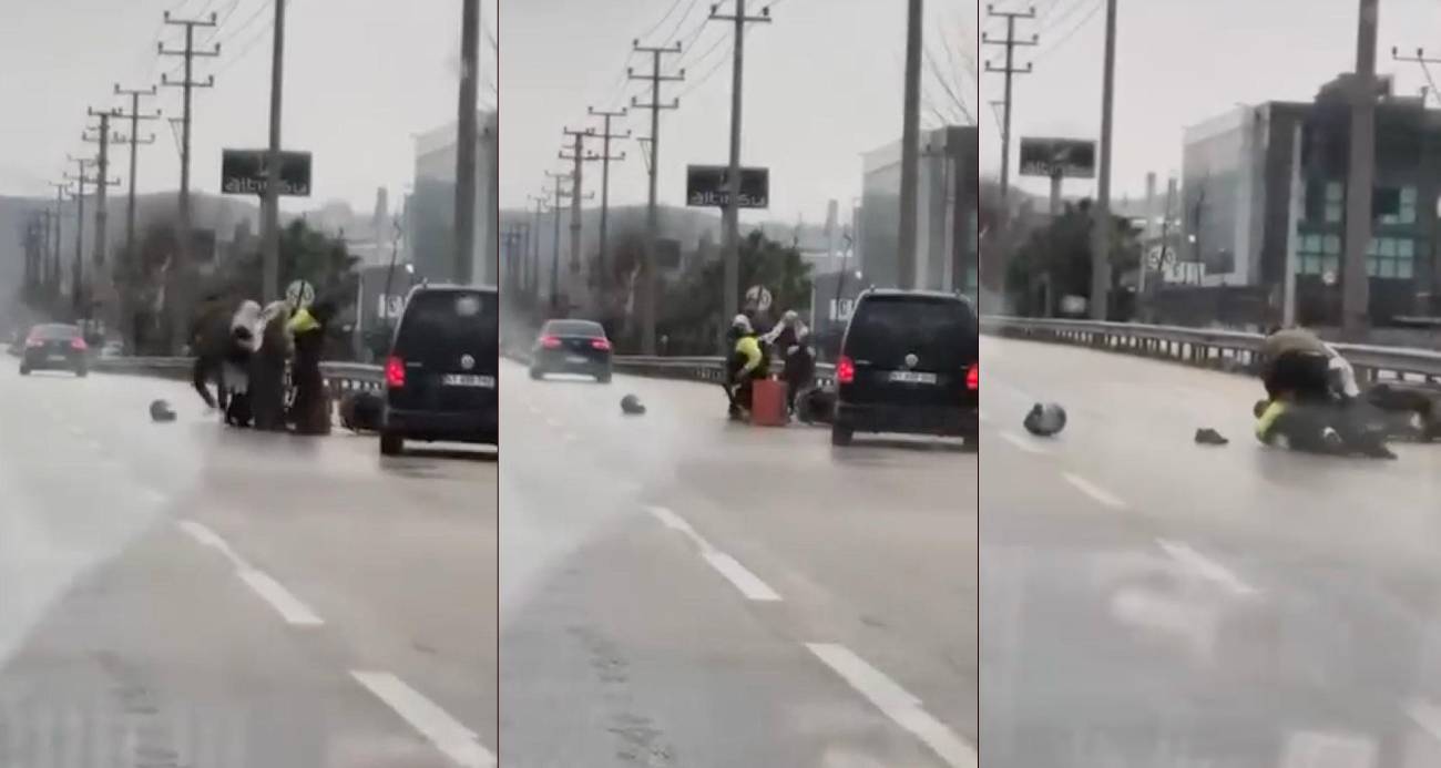 Bursa’da mendil satanlar ile bir sürücü arasında tartışma çıktı. Akan trafikte yol ortasında başlayan sopalı kavga, amatör kameraya yansıdı.